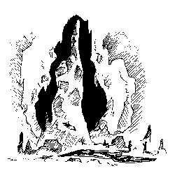 Mikor utolértem, újabb csoda tárult a szemem elé. Ahogy meg tudtam állapítani, hozzávetőlegesen a barlangcsarnok közepén állhattunk, ahol egy ébenfekete sziklacsonk meredt merészen a barlang mennyezete felé. Akkora lehetett, mint egy templomtorony, s úgy nézett ki, mintha egy eltemetett sziklaóriás megkövesedett keze mutatna konok elszántsággal a Felszín felé.