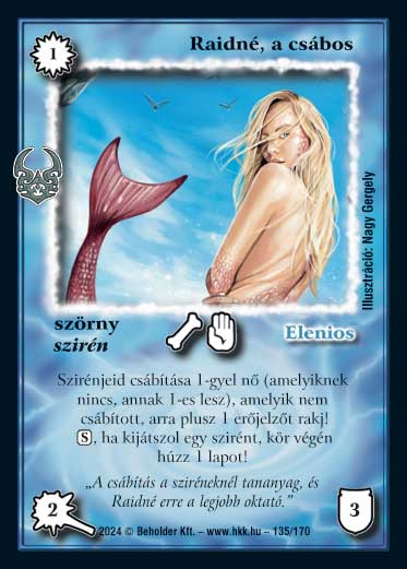 Kiadás: Ősi Káosz Gyakoriság: nem gyakori Lapszín (isten): Elenios Típus: szörny Altípus: szirén Szöveg: Szirénjeid csábítása 1-gyel nő (amelyiknek nincs, annak 1-es lesz), amelyik nem csábított, arra plusz 1 erőjelzőt rakj. (S), ha kijátszol egy szirént, kör végén húzz 1 lapot! Szinesítő szöveg: "A csábítás a sziréneknél tananyag, és Raidné erre a legjobb oktató." Illusztráció: Nagy Gergely