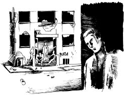 Diemos a sikátorokon át közelítette meg az épületet. A főbejáratot messze elkerülte, bár csak pár bandatag üldögélt a lépcsőnél sörözgetve, akiket ha kiiktat, csak felhívná magára a figyelmet. Márpedig ez túl nagy luxus lenne a részéről, mivel a tömeg nem jelentett védelmet többé. Halkan osonva megközelítette a tűzlépcsőt, majd óvatosan mászni kezdett rajta - fel az első szintig.